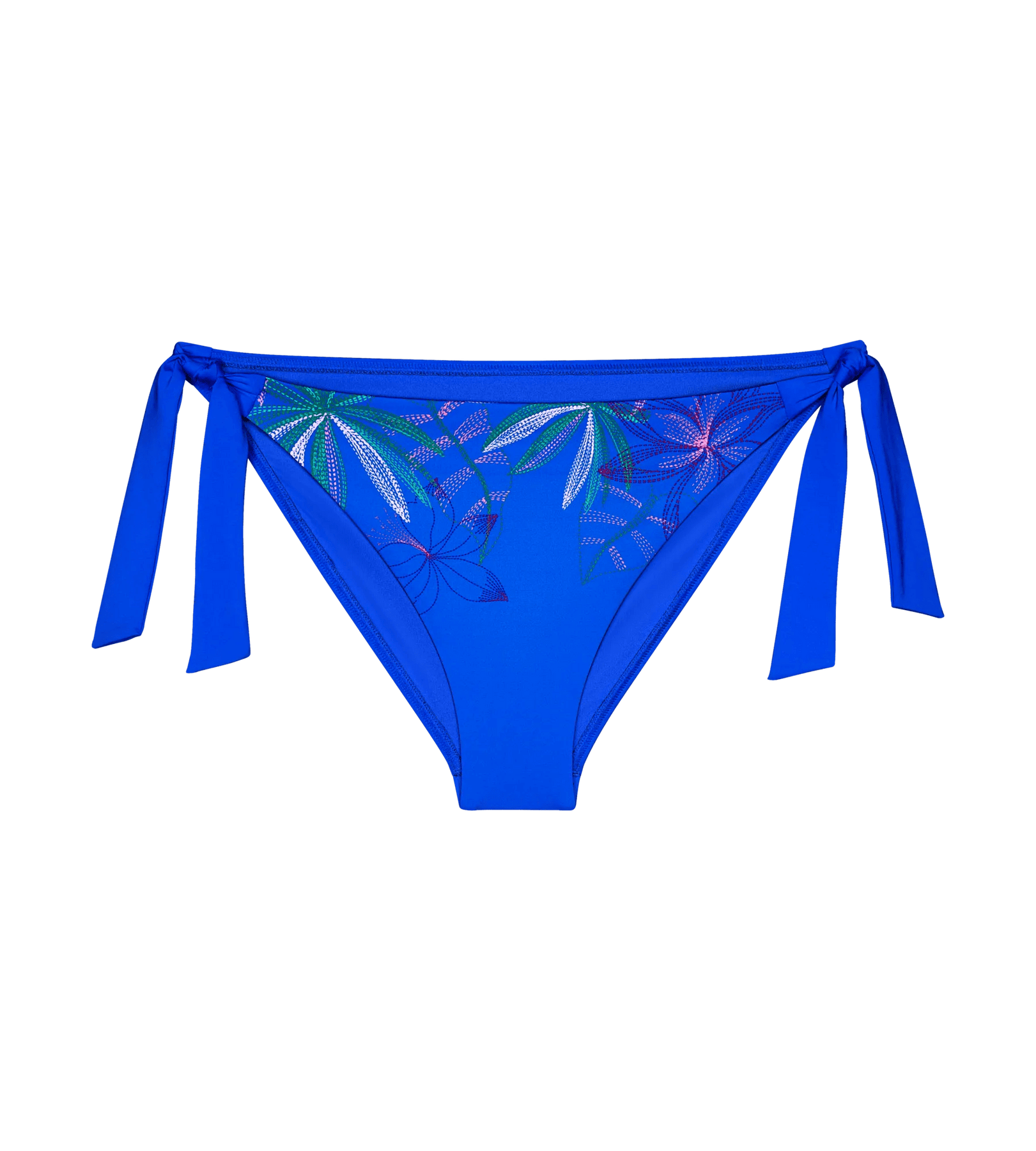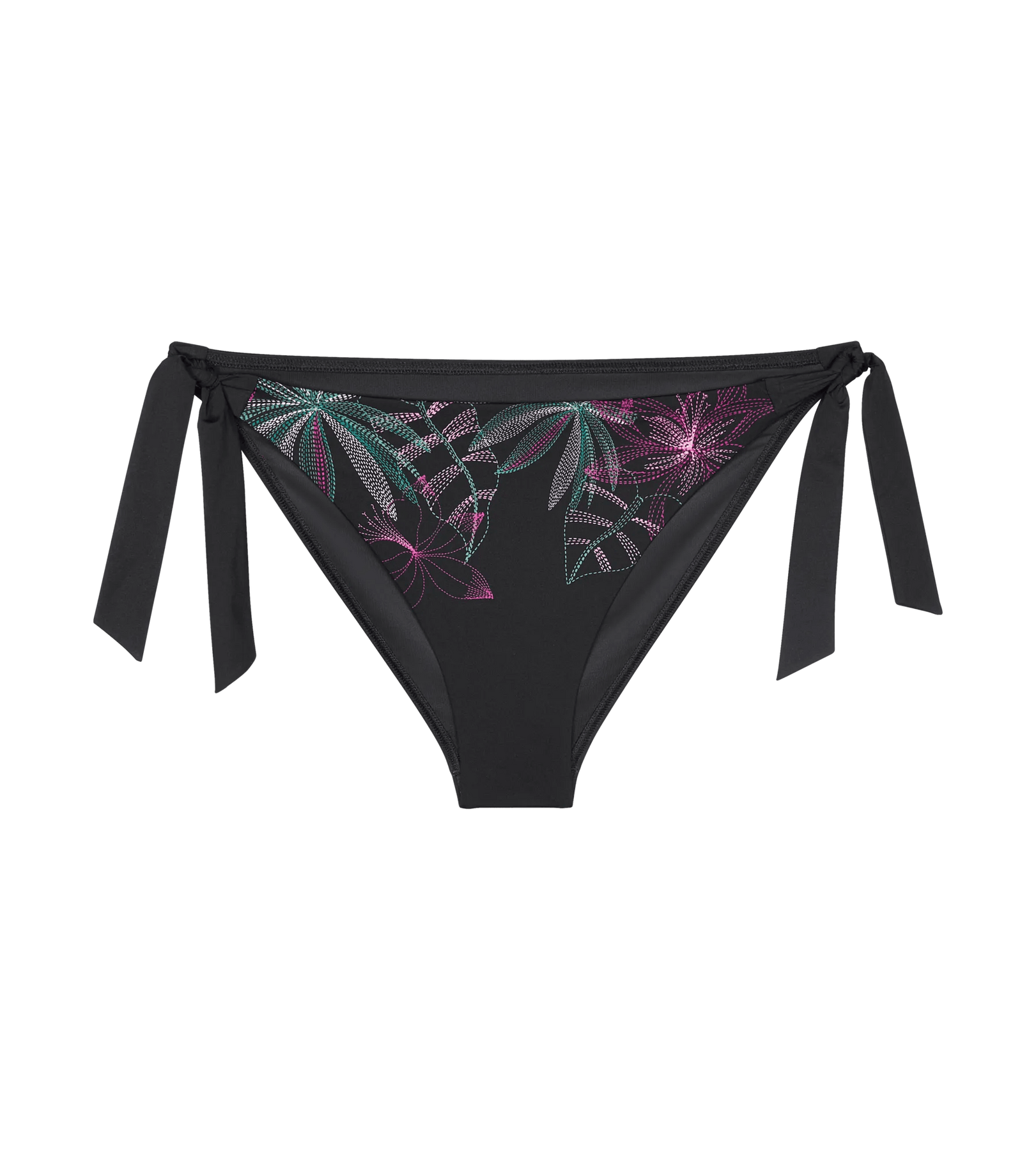 Bikini cu acoperire medie, cu snururi laterale reglabile decorate cu margele metalice. Realizat din material modelator certificat GRS, cu 55% poliamida reciclata, ofera sustinere si rezistenta in timp.