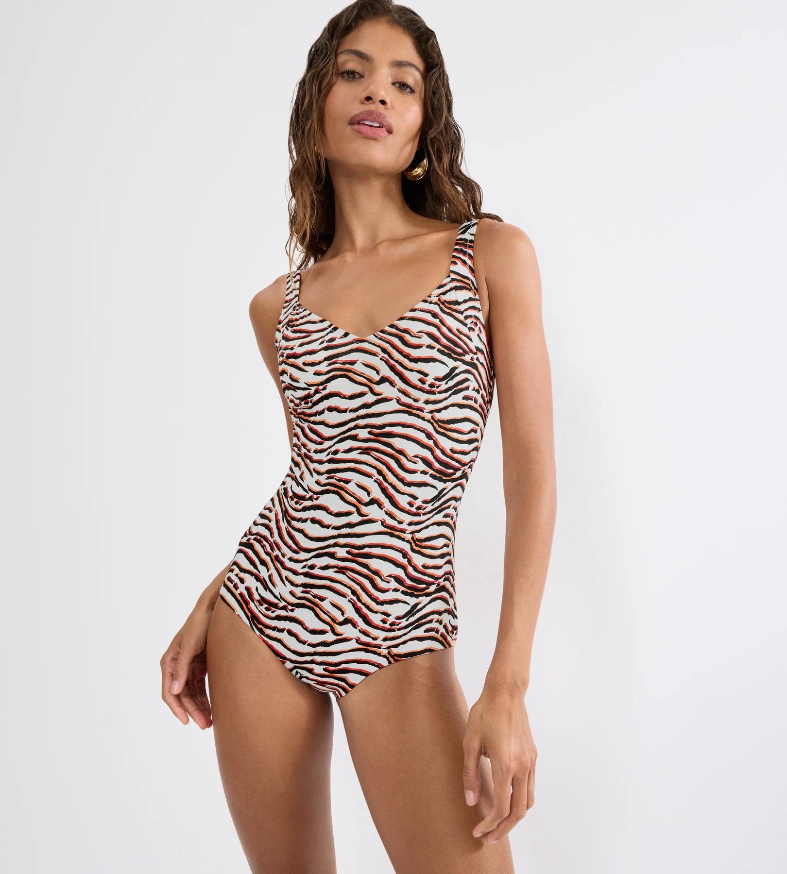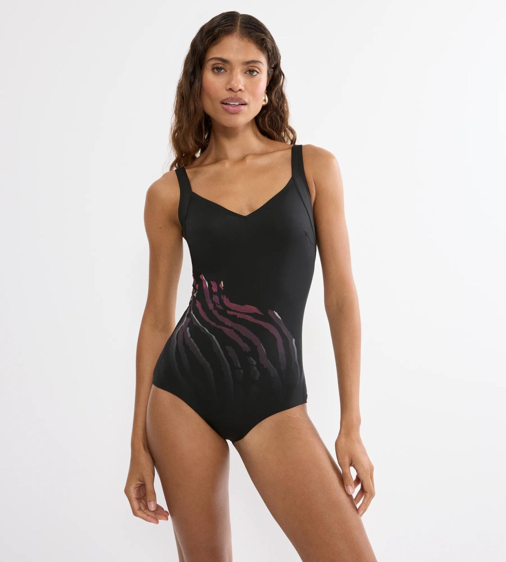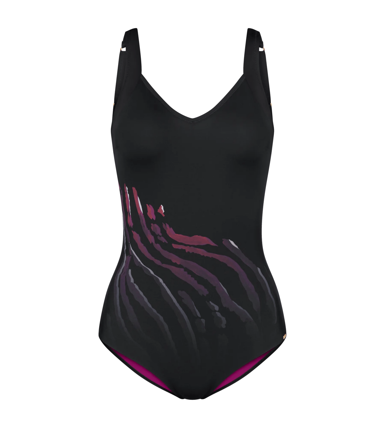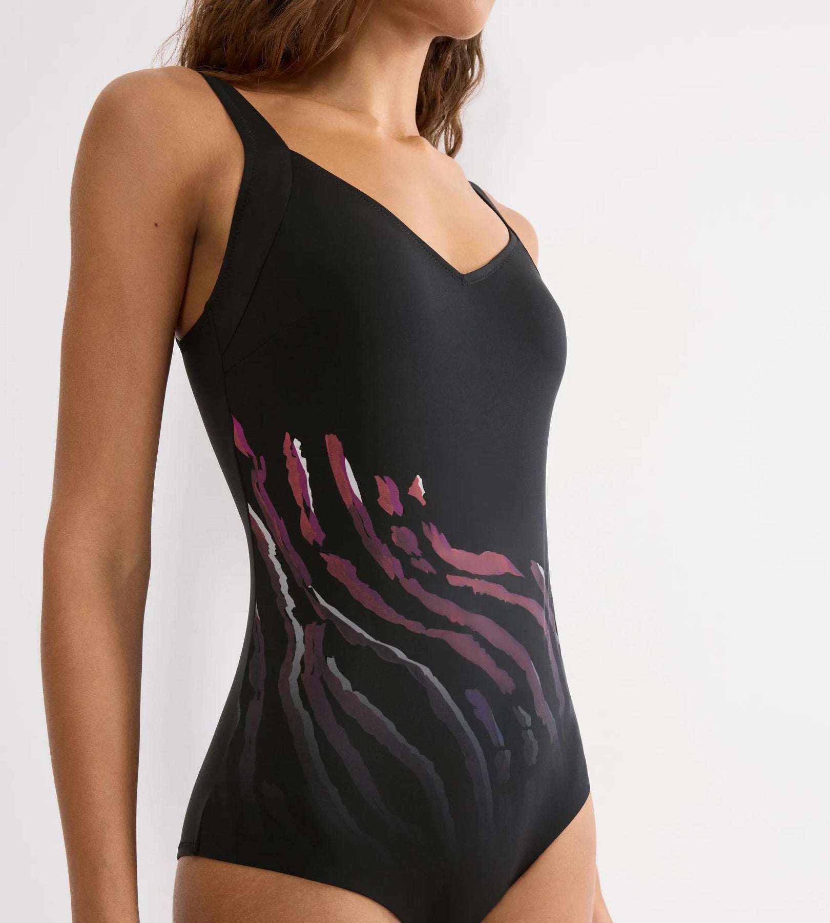 Costum de baie fara armatura, cu cupe buretate, cu decolteu in V pentru un efect flatant. Realizat din material modelator certificat GRS, cu 55% poliamida reciclata, ofera sustinere si rezistenta in timp.